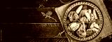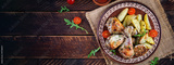 Baked chicken legs with slice potatoes and herbs. Barbecue chicken drumsticks on wooden table. Top view, banner, copy space.