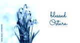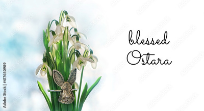 Blessed Ostara greeting card. snowdrops and metallic decorative rabbit, symbol Ostara or Easter holiday. festive spring season. wicca pagan tradition