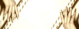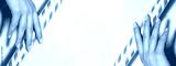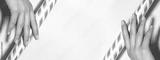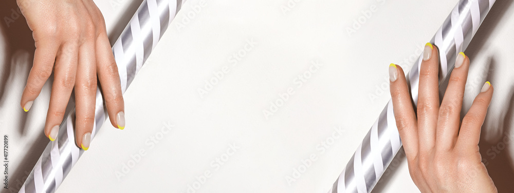 Hands with bright yellow french manicure. Nails art design. Close-up of hands with trendy neon nails on striped print