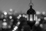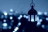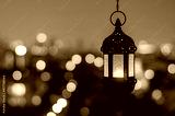 Hanging lantern with night sky and city bokeh light background for the Muslim feast of the holy month of Ramadan Kareem.