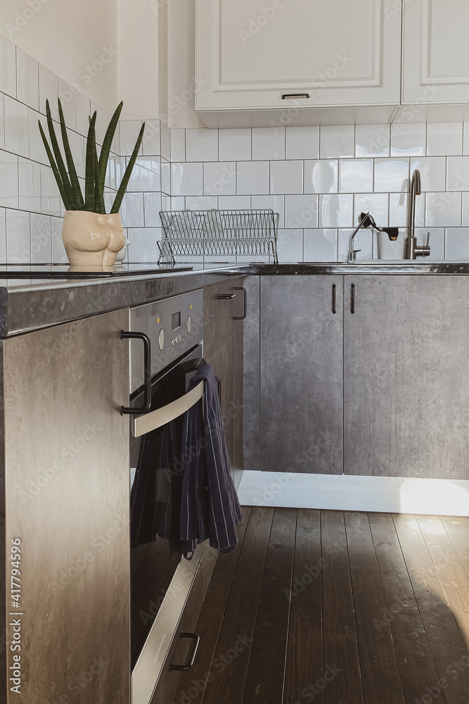 Modern scandinavian style home kitchen interior concept. Cozy comfortable boho interior design.