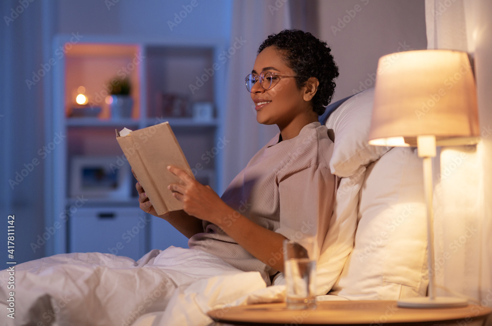 people, bedtime and rest concept - happy smiling young african american woman in glasses reading book in bed at home at night