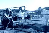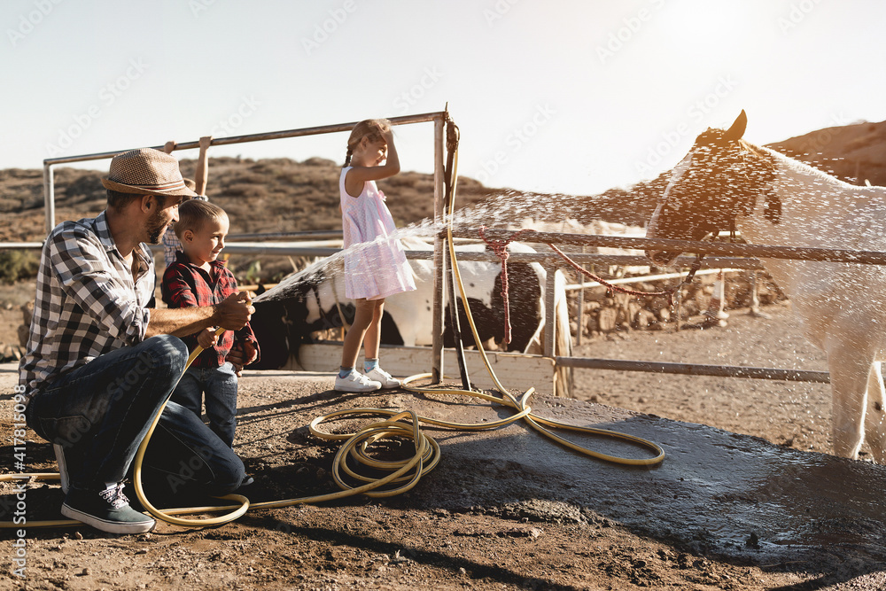 Happy family having fun together at ranch farm - Focus on left faces