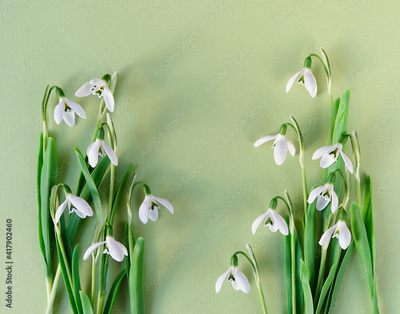 Blossom snowdrops flowers on green background. spring season. romantic gentle nature image. hello spring, 8 march, Mother's day concept. flat lay. copy space