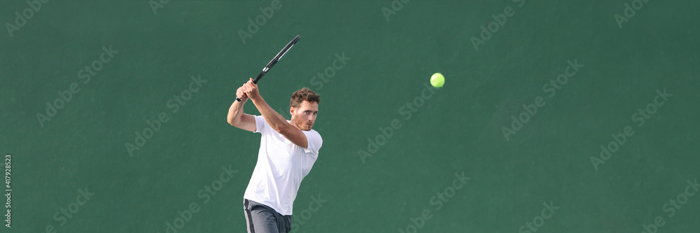 Tennis player man playing hitting ball with racket on green horizontal banner background. Sports athlete training grip technique on outdoor court.