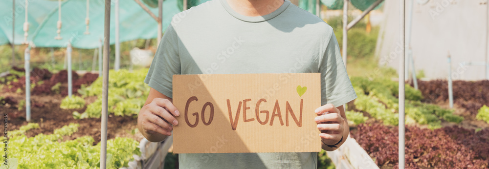 Closeup hands of a man holding a placard cardboard say "Go vegan" standing in a vegetables greenhouse. Vegan diet, Plant-based eating, Sustainable living lifestyle, Farm to fork, Global warming.