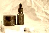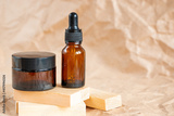 Cometic bottles made of amber glass on crumpled craft paper. Skin care products packaging design. Spa concept.
