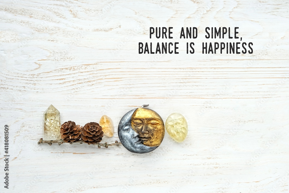 Pure and simple, balance is happiness. symbolic moon wax candle, crystal gemstones and cones on white wooden background. life balance, esoteric, spiritual practice concept