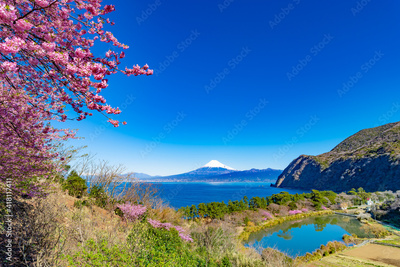 静岡県沼津市井田 河津桜咲く明神池と富士山