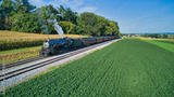 Aerial View of An Antique Restored Steam Locomotive Blowing Smoke and Steam Traveling Thru Farmlands and Countryside on a Sunny Summer Day