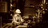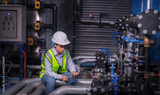 Industry engineer under checking the industry cooling tower air conditioner is water cooling tower air chiller HVAC of large industrial building to control air system.