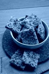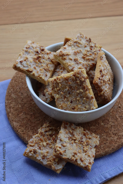 Traditional italian cookies with hazelnut and sugar glaze in a bowl on wooden table