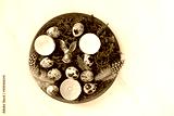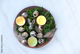 Easter composition. plate with Easter eggs and diy candles in eggs shells, rabbits, moss. symbol Ostara or Easter holiday. festive spring season. wicca pagan tradition. flat lay