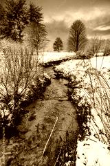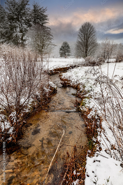 Small stream winds through snow covered scene in the mountains of Pisgah Forest