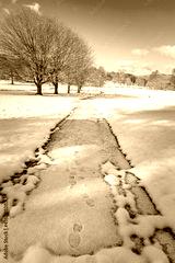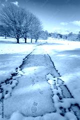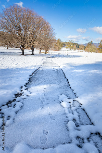 White sidewalk cuts through the meadow and trees covered in freshly fallen snow