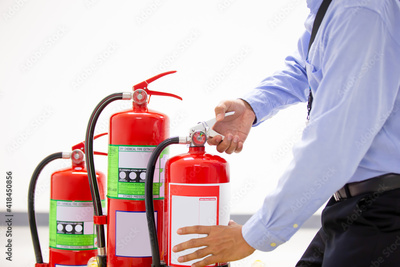 Firefighter checking the handle of the red fire extinguishers tank in the building concepts of prevent case for emergency and safety rescue and fire training.