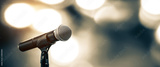 Public speaking backgrounds, Close-up the microphone on stand for speaker speech presentation stage performance with blur and bokeh light background.