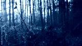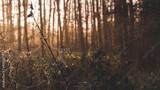 Pajęczyna na krzakach o poranku z drzewami w tle
