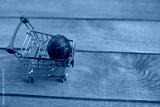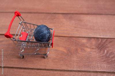 Single marble blue Easter egg in small shopping trolley on a wooden background. Happy Easter 2021.
