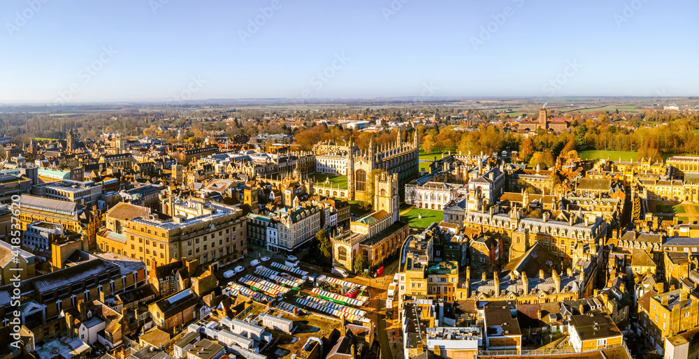 The aerial view of Kings college in Cambridge, a city on the River Cam in eastern England