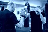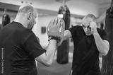 Instructor holds focus mitts. Boxing kick training and demonstration