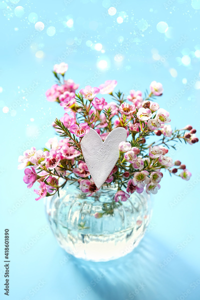 pink flowers and heart on abstract blue background. spring season. romantic gentle nature image. hello spring, Mother's day, Valentine's day, birthday concept