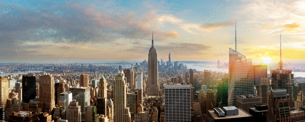 New York City skyline from roof top with urban skyscrapers before sunset.New York, USA. Panorama image..