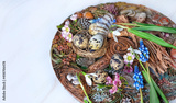 Wiccan Altar for spring Ostara sabbath. wheel of the year with flowers, feathers and eggs. Esoteric Ritual for pagan holiday. Magical Spring equinox