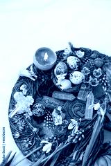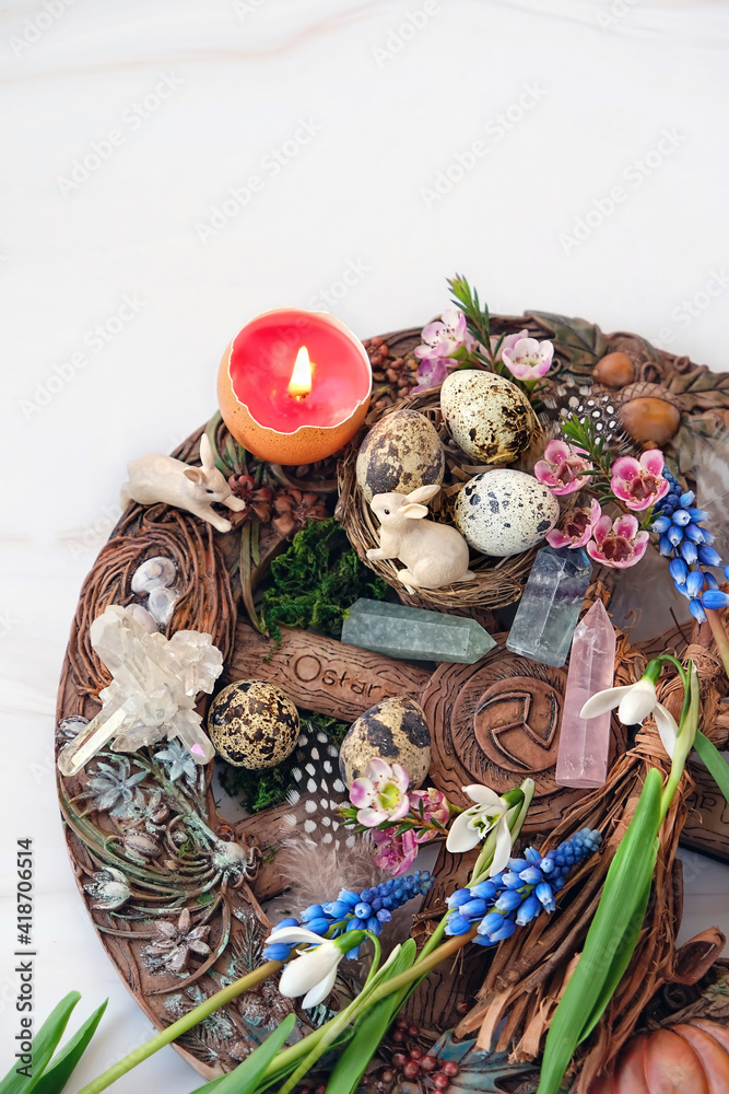 wiccan Altar for spring Ostara sabbath. wheel of the year with rabbits, candle, gemstones crystals, flowers and eggs. Esoteric Ritual for Ostara, pagan holiday. Magical Spring equinox