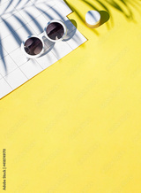 Summer yellow cosmetics flat lay with sunglasses . Top view beauty composition. Copy space