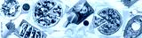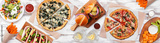Healthy plant based fast food table scene. Overhead view on a white wood banner background. Cauliflower crust pizzas, bean burgers, mushroom tacos and vegetarian sides.