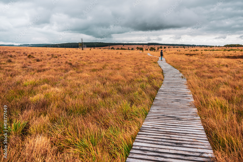 Landscape in the High Fens Nature Park in the Eifel, Belgium. Hike in the nature park.