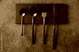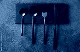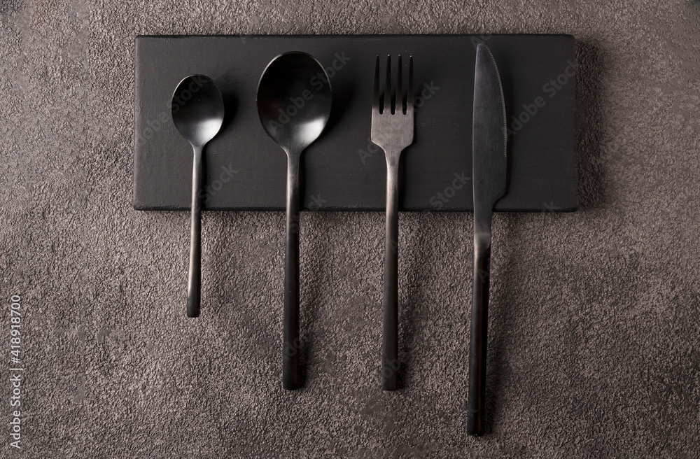 Black cutlery set - fork, spoon, knife, on dark wood . Minimalistic still life, stylish dinnerware