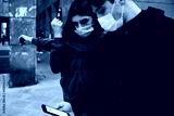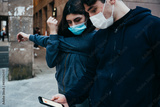 Couple of friends take a break from training watching results on the smartphone app while woman does stretching exercises with arms wearing protective face masks from Coronavirus Covid-19 infections
