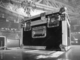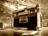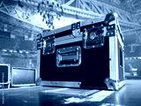 Box rack for transportation of concert equipment. Wardrobe trunk on background of concert venue. Rack wardrobe trunk on stage. Concept - sale of rack cases for concert equipment. Musical equipment