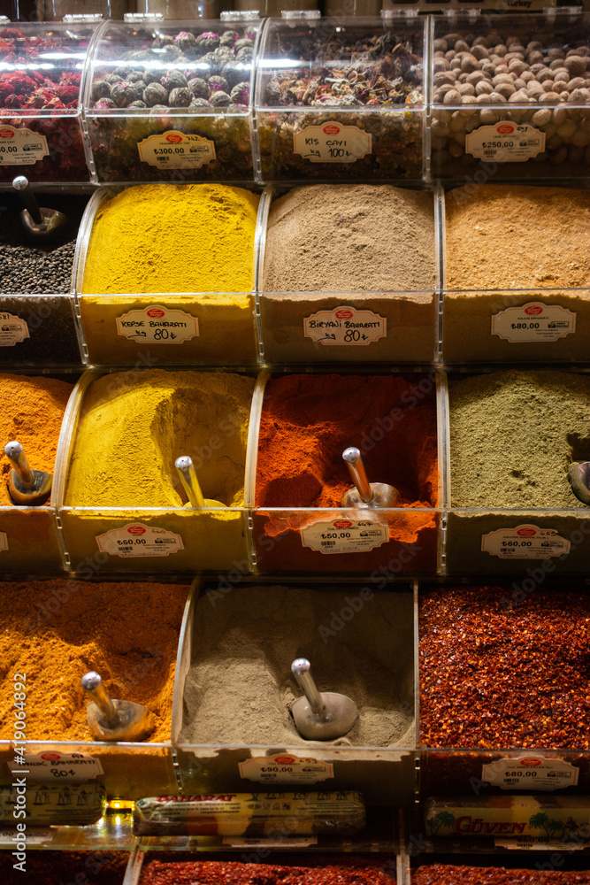 Colorful spices in the Turkish Grand Spice Bazaar in Istanbul, Turkey