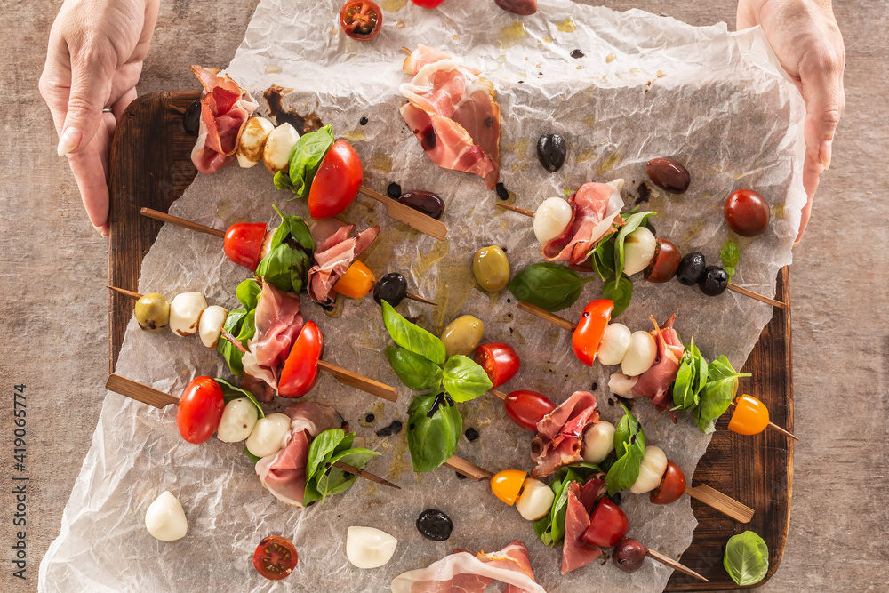 Caprese skewers italian or mediterranean appettizer tomatoes mozzarella olives and prosciutto