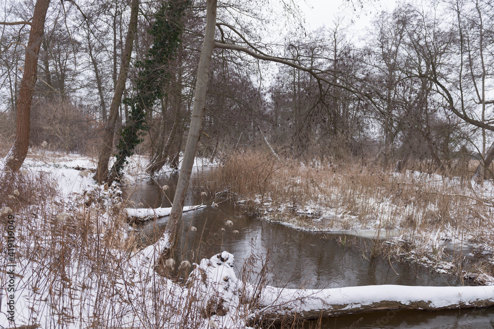 Mała rzeka zimą. Brzegi pokryte warstwą śniegu.