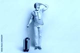 Photo of aged man happy smile baggage trip tourist vacation air fly look ahead sweater on shoulders isolated over pink color background