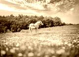 Fantastic view of floral pasture with Arabian horse in the sunlight.