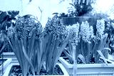 Blooming hyacinths in pots in a greenhouse in spring.