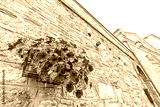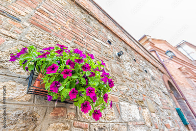 Chiusi, Italy closeup of stone wall wide angle view of historic old building in town village in summer with purple petunia flowers