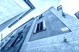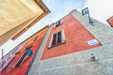 Chiusi, Italy street looking up view in small historic medieval town village in Umbria with red yellow bright vibrant colorful painted wall
