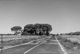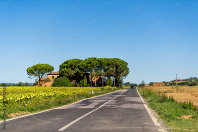 Small road street in town village in Tuscany during day with house building and cypress trees and many sunflowers in farm blue sky