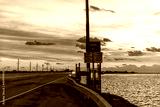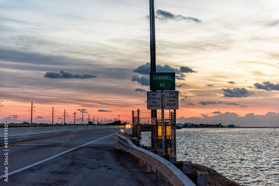 Cloudy sky at sunrise in Islamorada, Florida Keys with red orange sky overseas highway road in Atlantic Ocean by Gulf of Mexico with power lines, no fishing and stopping on bridge sign