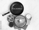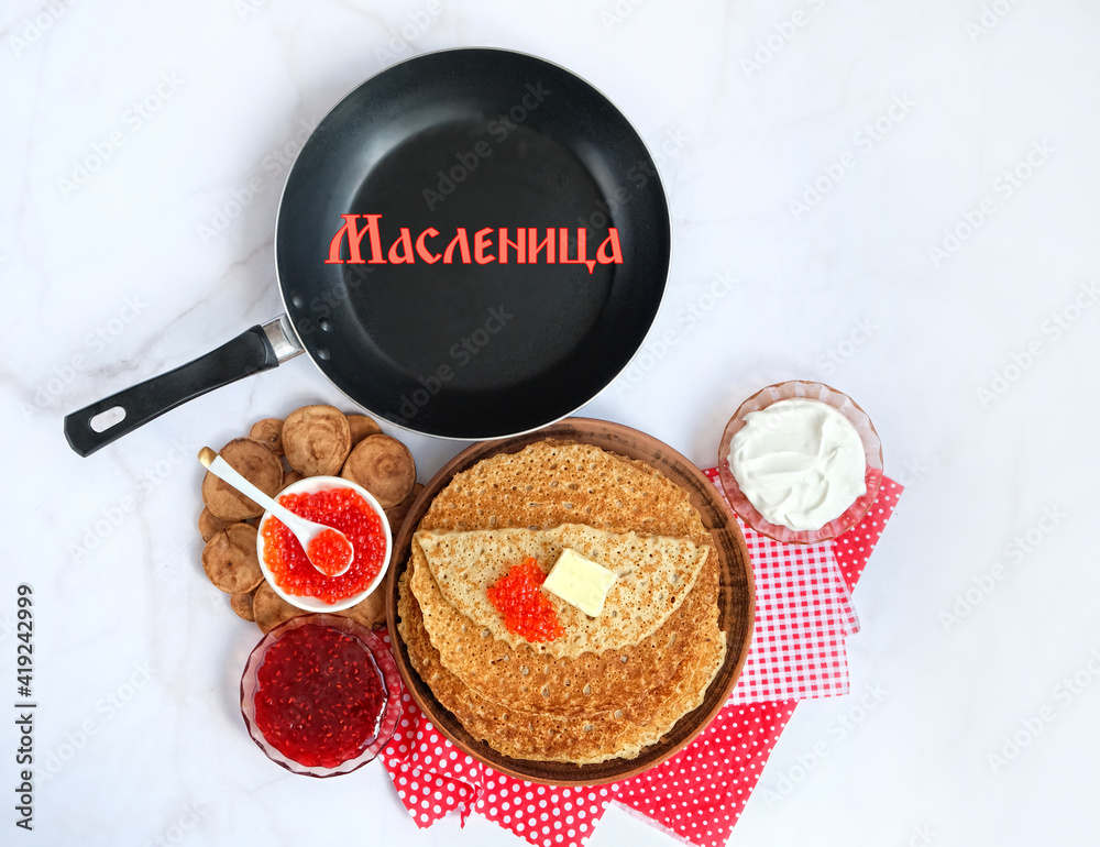 Maslenitsa - text on russian language. Pancakes, frying pan, red caviar, sour cream, jam on light background. flat lay