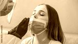 Doctor taking nasopharyngeal culture, PCR test to woman patient. Nurse take saliva sample through nose with cotton swab to check coronavirus covid 19. Long web banner