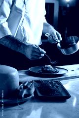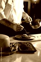 Professional cook in uniform add some spices to dish, decorating delicious meal for guests in hotel restaurant. food, cooking concept