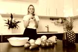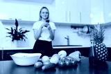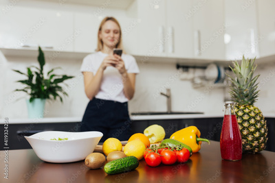 Young woman looking at new recipe in smartphone in kitchen. Girl cooking at home, preparing healthy vegetable salad. FOCUS ON FOOD.