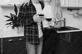 Couple is enjoying romantic moment together in kitchen with glasses of red wine during romantic dinner.